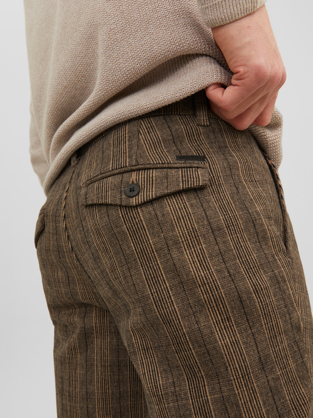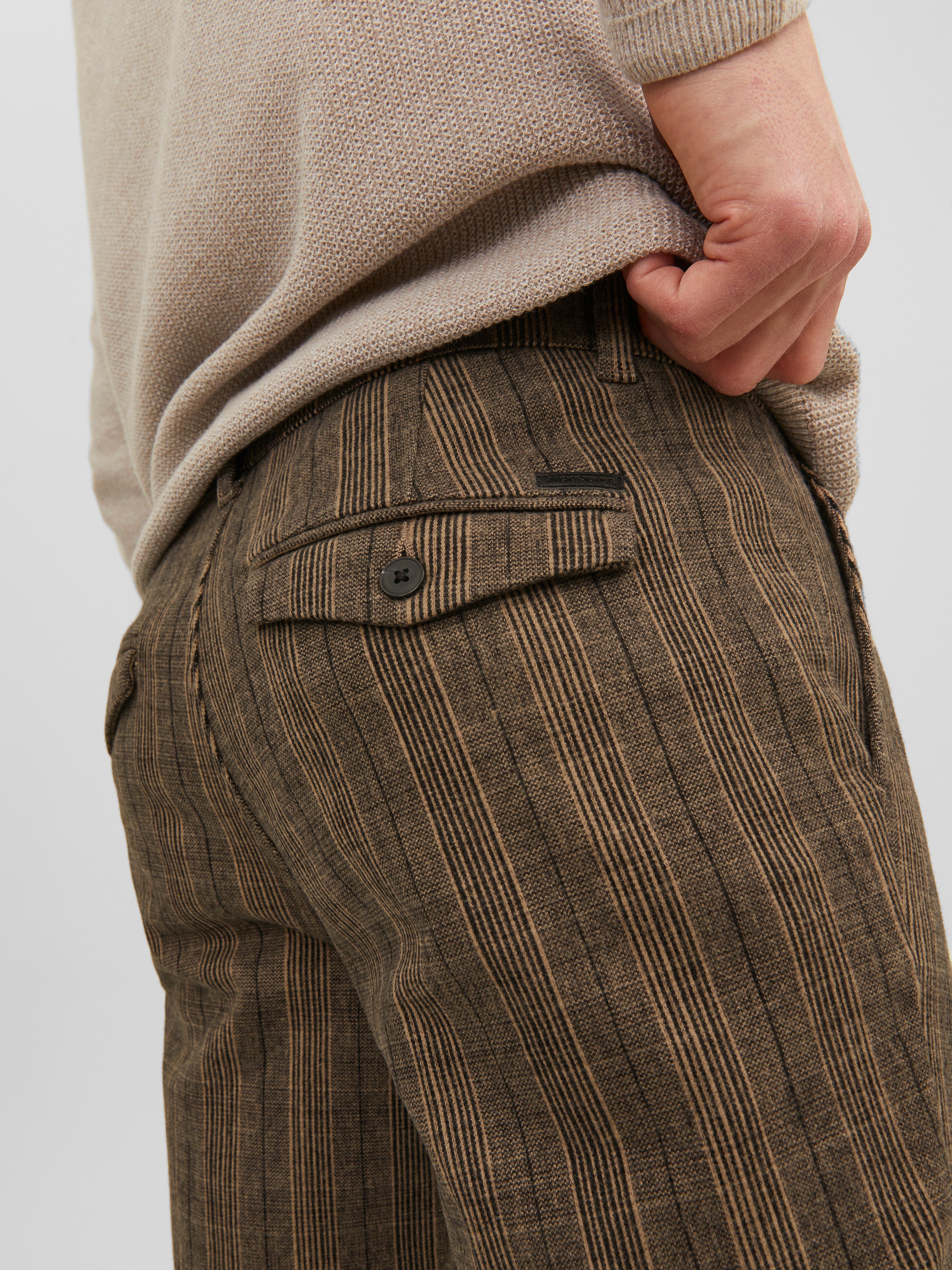 Die Chino-Hose ist in dieser Kategorie ein essenzieller Style. Sie steht zwischen Anzughose und lässiger Five-Pocket-Hose. Das Styling ist schlicht, Taschen gibt es nur vorn und hinten.