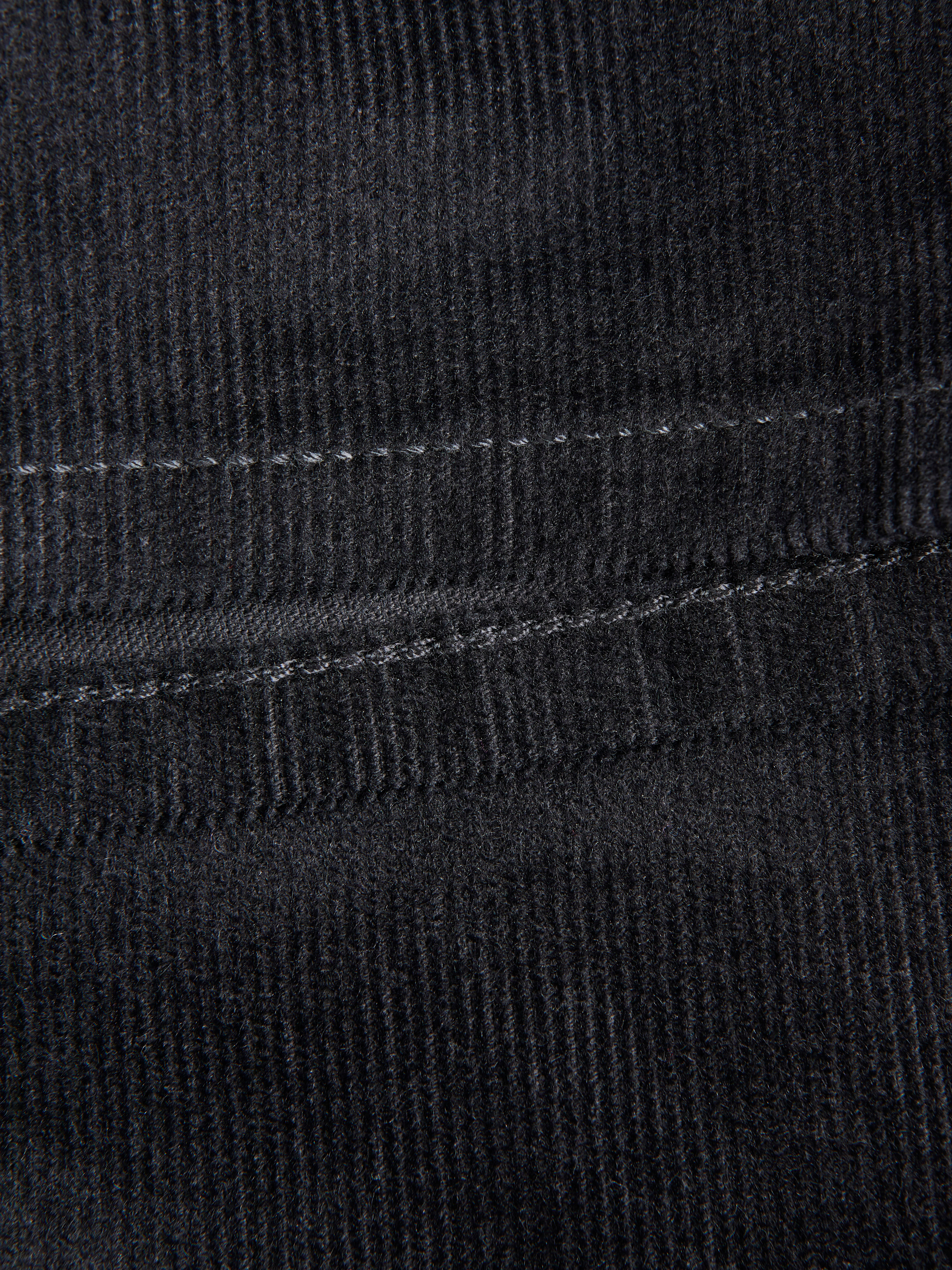 Corduroy is a ribbed, velvety fabric with a thick texture for warmth and volume.