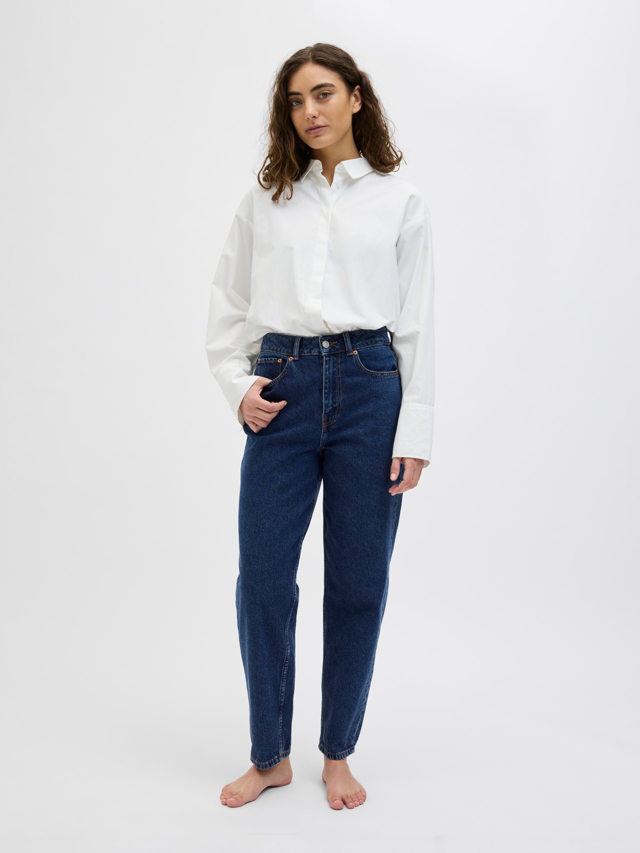 Nosta arkityylisi uudelle tasolle välttämättömillä farkuillamme. Nämä ajattomat farkut on suunniteltu mukavuutta ja monipuolisuutta ajattelemaan, ja ne ovat välttämätön hankinta jokaiseen vaatekaappiin. Ne sopivat täydellisesti kaikkiin tilaisuuksiin, ja ne täydentävät vaivattomasti muita suosikkitallikappaleitasi. Denim on kestävä toimikaskangas, jolle on ominaista värjätty loimilanka ja kude, jotka on kudottu yhteen. - Tuotetyyppi : Mom fit -farkut - Sulkeminen : Vetoketjusepalus - Taskut : Takataskut, Kolikkotasku, Etutaskut - Vyötärö : Korkea vyötärö - Lisä yksityiskohdat : Vyölenkkiä, Niitit - Pesu/viimeistely : Huuhtelupesu poistaa ylimääräisen väriaineen tehden vaatteesta pehmeän tuntuisen ja siistin näköisen - Malli : Korkea vyötärö, normaalisti istuva, kapeneva lahke