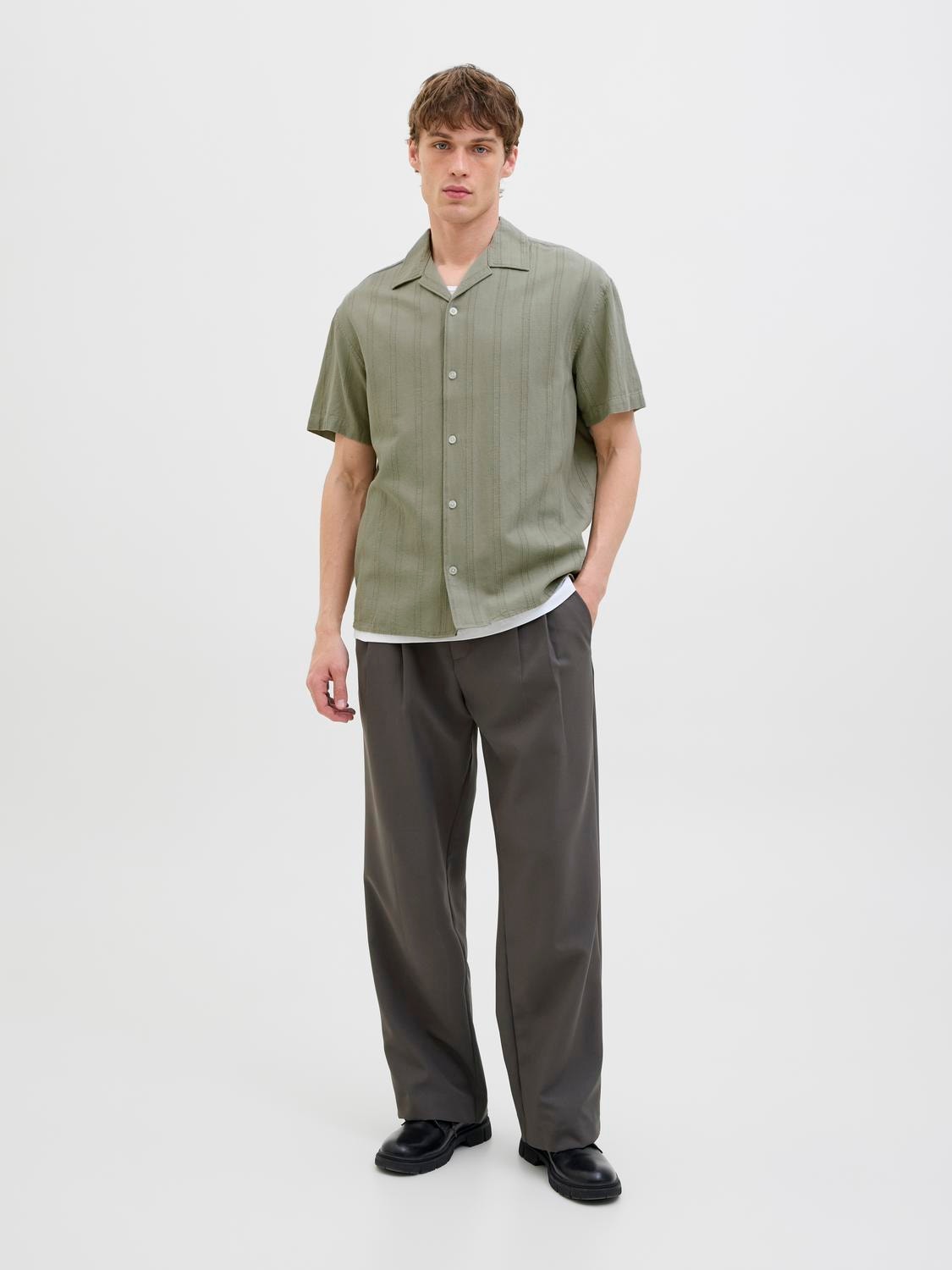 Dobby-kankaassa on pieniä geometrisiä kuvioita, jotka lisäävät tekstuuria hienostuneeseen ilmeeseen.
