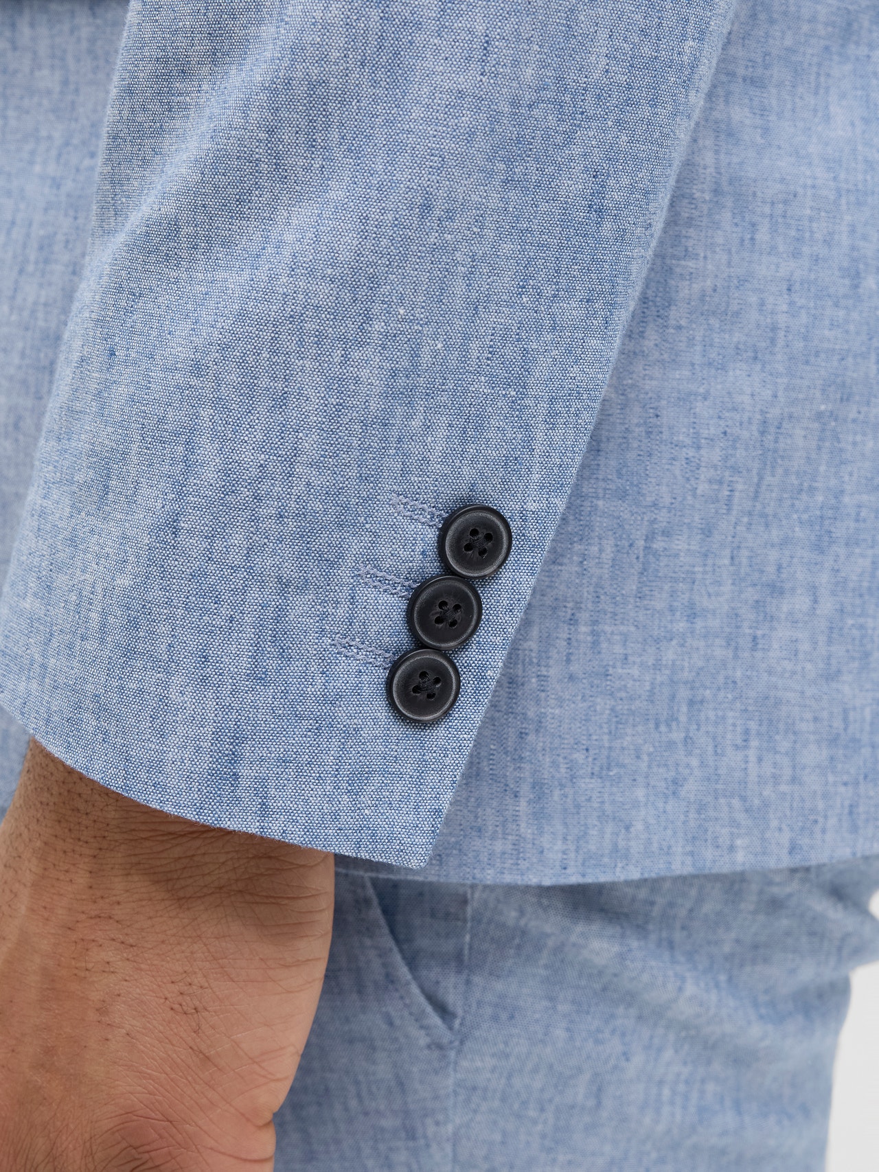 - Ulkopuoli: 70% Puuvilla, 28% Pellava, 2% Elastaani; Vuori: 100% Polyesteri