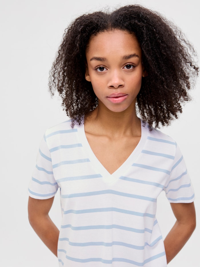 Šie pagrindiniai marškinėliai yra būtinas drabužių spinta, kuri puikiai dera su džinsais, šortais ir kelnėmis.