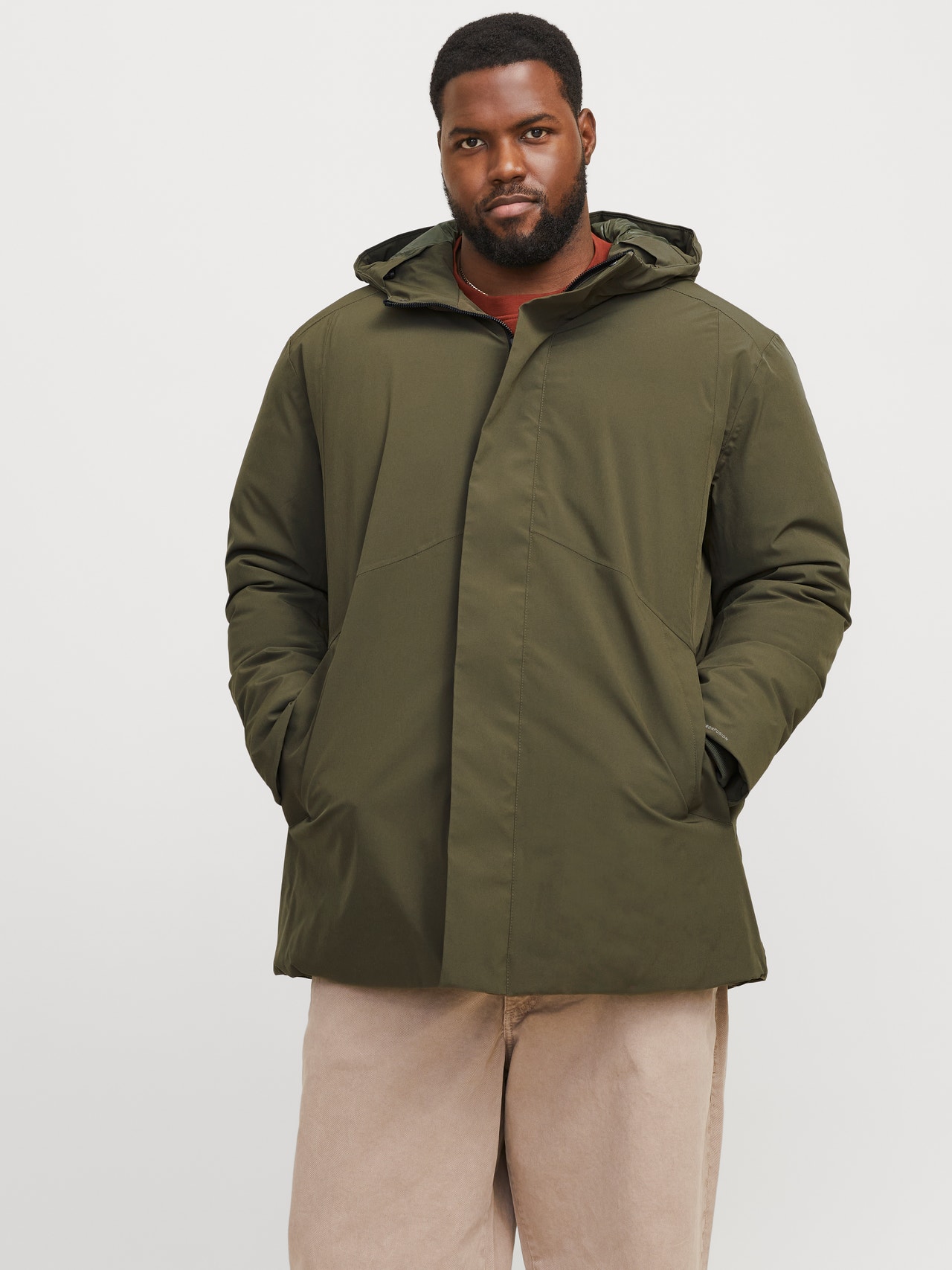 Denne varme, isolerende jakken er perfekt til de kalde vintermånedene. Softshell er et mykt, vannavvisende og slitesterkt stoff som er perfekt for optimal ytelse og utendørsaktiviteter. Plus-styles er designet for å passe til kropper i plus size. - Produkttype : Parka - Funksjonalitet : Vindtett - Hals : Hette med snorregulering - Erme : Lange ermer - Mansjetter : Ribbemansjetter - Lukking : Glidelåslukking - Lommer : Forlommer - Lengde/størrelse : Lang - Fôr : Resirkulert polyesterfor for en behagelig følelse - Fyll : Resirkulert polyester for varme - Detaljer : Stormklaff for å forhindre at vinden trenger inn - Kroppstype : Plus