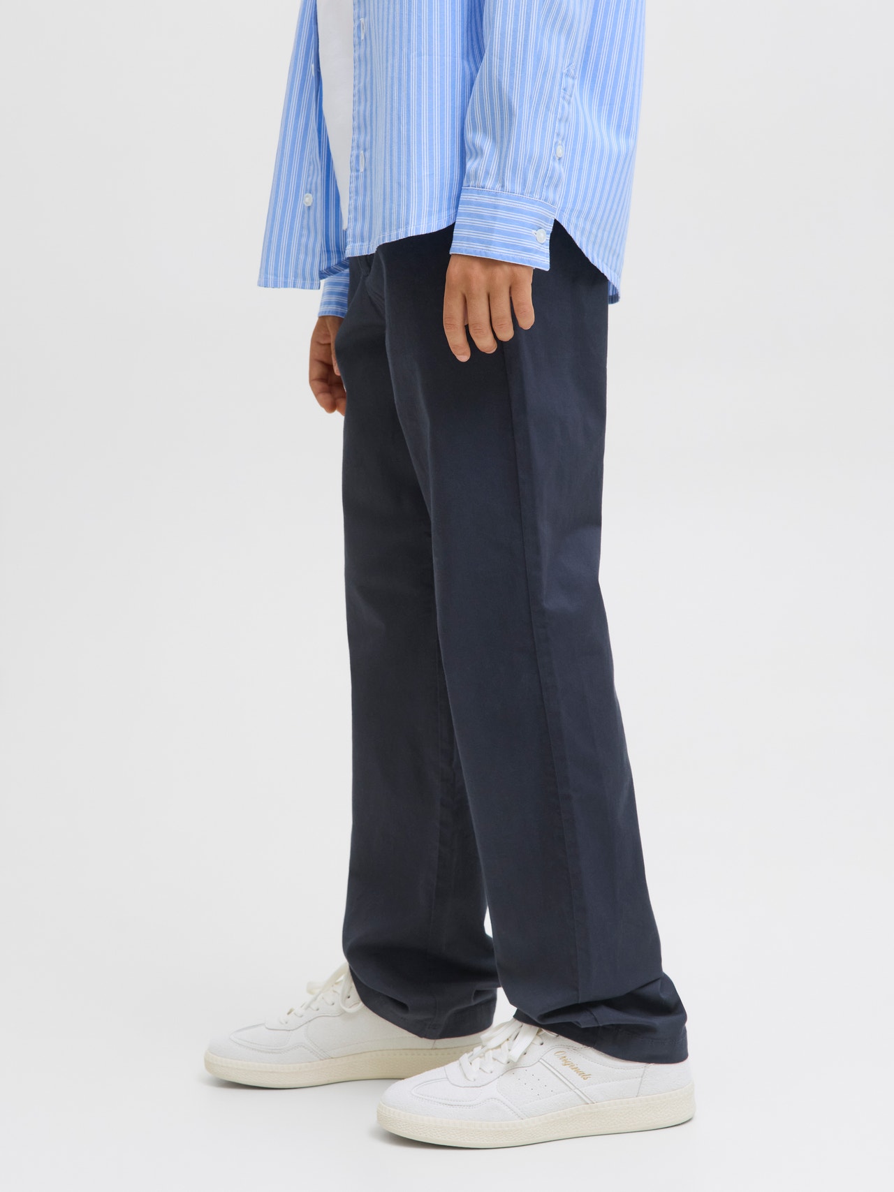 Fritidsklær er avslappede og passer til hverdagsbruk. Vevd stoff er et solid og slitesterkt materiale som ikke strekker seg som strikkede stoffer. Oppdag den kule verdenen til JACK & JONES Junior, hvor mote blir virkelighet med et utbrudd av ungdommelig energi og livlig sjarm. Våre kolleksjoner er en blanding av freshe, trendy og kule design skreddersydd for gutter i alderen 3–16 år. Fordyp deg i komfortable styles av høy kvalitet som fremhever guttemote. Fra kule passformer til moderne stil, JACK & JONES Junior redefinerer mote for alderen 3–16 og omfavner voksenånden i hvert antrekk.. - Produkttype : Bukser med avslappet passform - Lukking : Glidelåsgylf - Høyde til midje : Middels høyt snitt - Detaljer : Elastisk linning - Passform : Avslappet passform med middels høyt snitt, avslappede lår, knær og benåpninger - Festetype : Ufestet snor - Festelengde : 10.0 - Festekomposisjon : Bomull