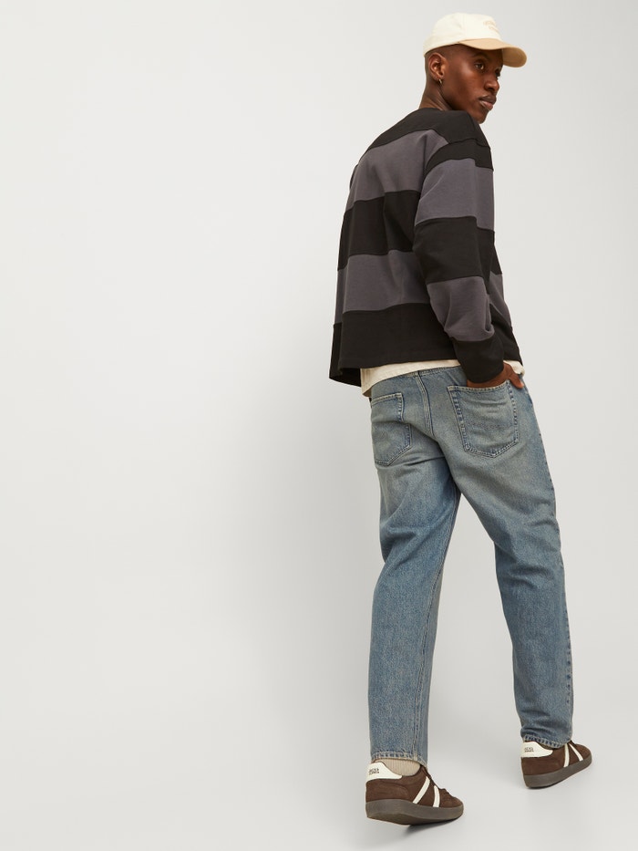 - Krój : Luźne dżinsy z wysokim stanem, luźne udo, luźne kolana, luźne rozcięcie nogawek