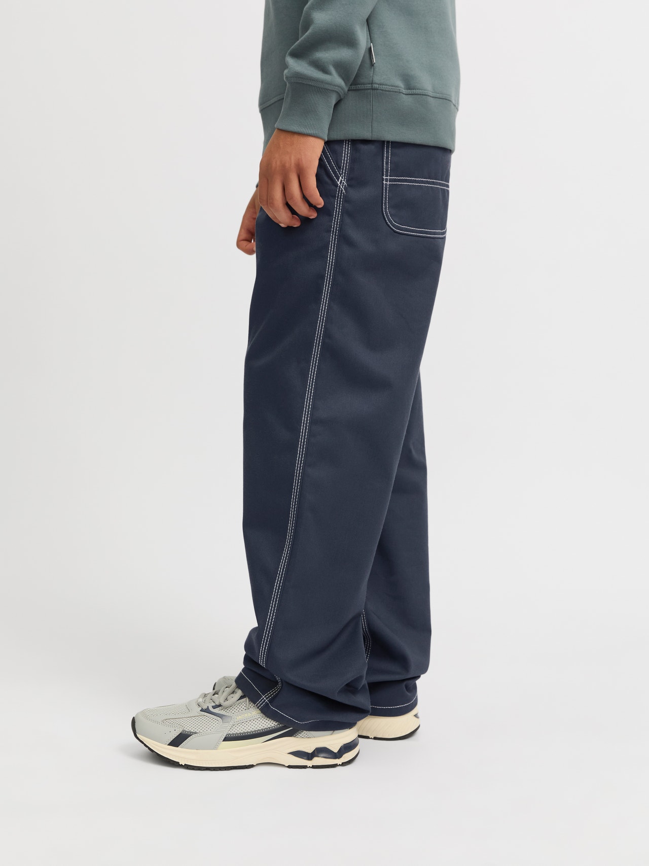 Twórz proste współczesne stylizacje z wygodnymi spodniami, a następnie ciesz się praktycznymi elementami i fajnym biurowym klimatem, zestawiając je z bluzą i trampkami lub kurtką i botkami. Tkanina jest wytrzymałym i mocnym materiałem, który w przeciwieństwie do dzianin nie rozciąga się. Odkryj stylowy świat Jack and Jones Junior, w którym moda ożywa dzięki młodzieńczej energii i urokowi. Nasze kolekcje to mieszanka nowoczesnych, modnych i fajnych wzorów dla chłopców w wieku 3-16 lat. Odkryj wysokiej jakości, wygodne stylizacje, które podkreślają modę chłopięcą. Od fajnych krojów po współczesny styl, Jack and Jones Junior na nowo definiuje modę dla chłopców w wieku od 3 do 16 lat i wprowadza ducha dorosłości do każdego stroju.. - Rodzaj produktu : Klasyczne spodnie - Zamknięcie : Rozporek zapinany na suwak - Kieszenie : Tylne kieszenie, Kieszenie przednie - Talia : Średni stan - Szczegóły dotyczące nóg : Wywijane brzegi - Szczegóły : Pętla młotkowa - Krój : Jeśli szukasz kroju, który jest luźny w każdym miejscu, wypróbuj krój wide. Dzięki szerokim udom, luźnym kolanom i szerokim mankietom sprawdzi się doskonale, gdy szukasz szerokich nogawek, ale bez przesady