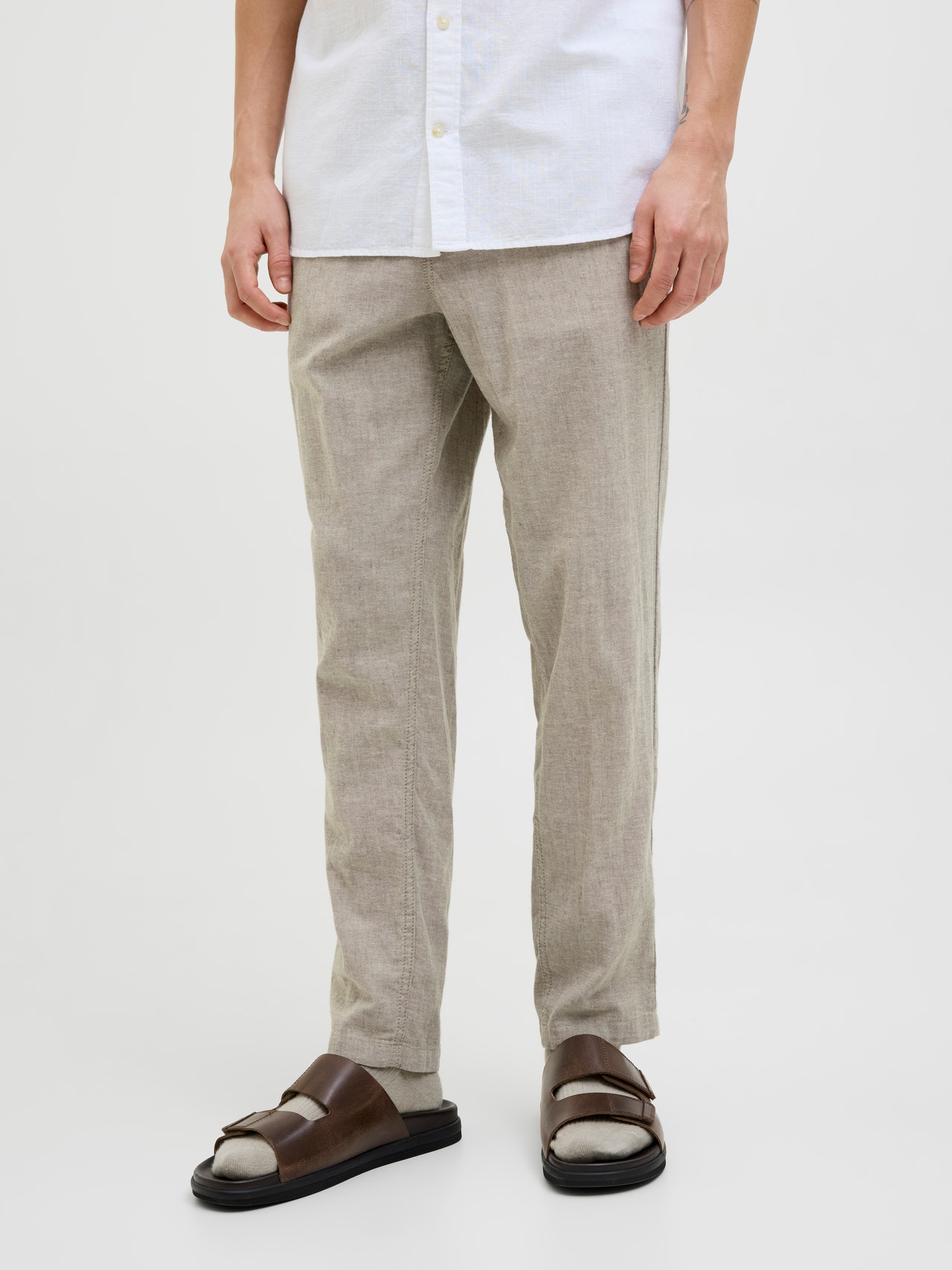 - 80% Algodão, 18% Linho, 2% Elastano