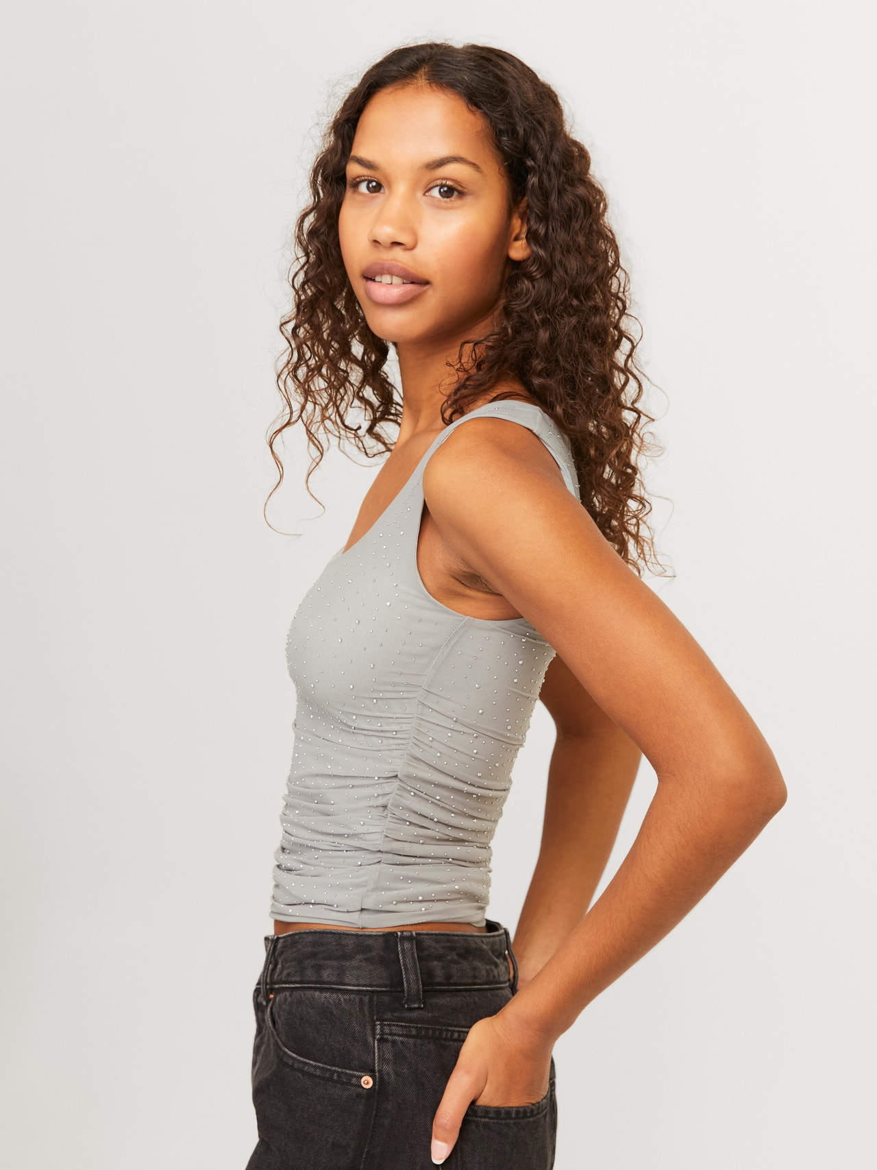 Modeli jonë është 173 cm i gjatë dhe ka një madhësi S
