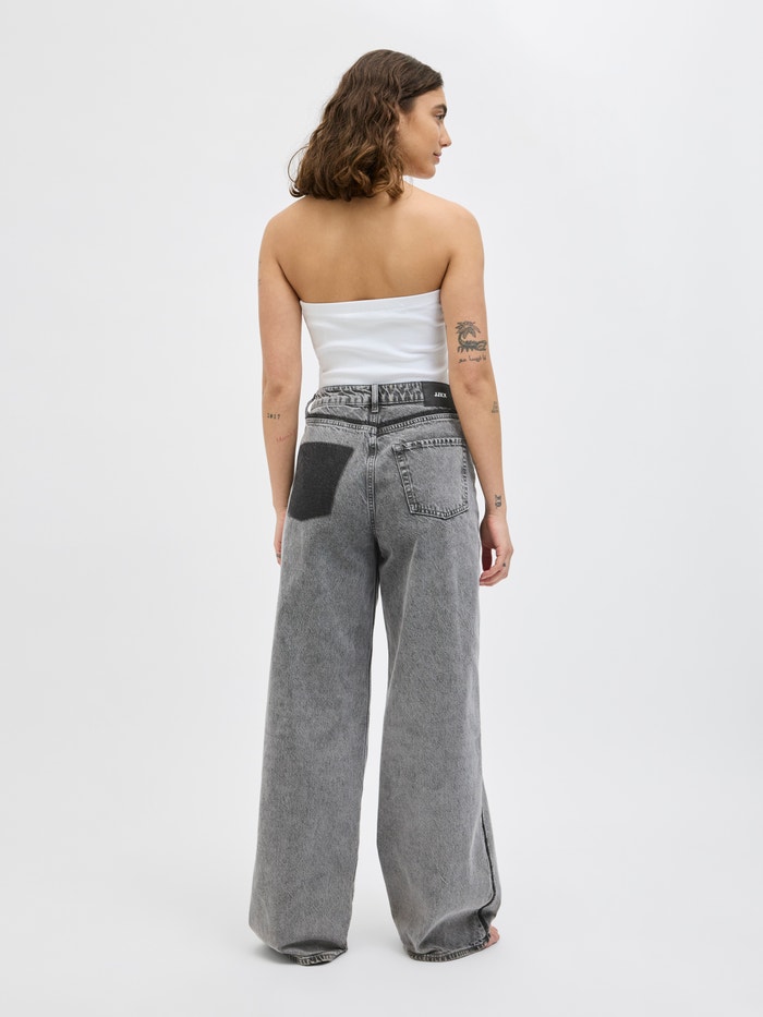 - Passform : Hög midja, avslappnad passform, vida ben