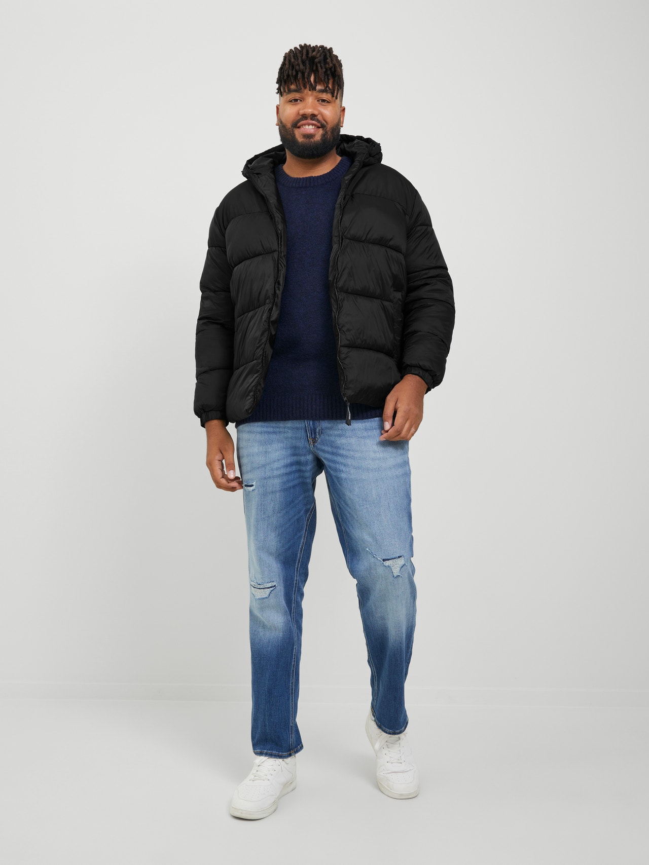 Plus styles are designed to fit plus-size bodies. - Product Type : Puffer jacket - Functionality : Windproof - Neck : Hood - Sleeve : Long sleeves - Cuffs : Cuffs with elastic binding - Length/Size : Short - Padding : Synthetic fibre down padding for a light feel and warmth
